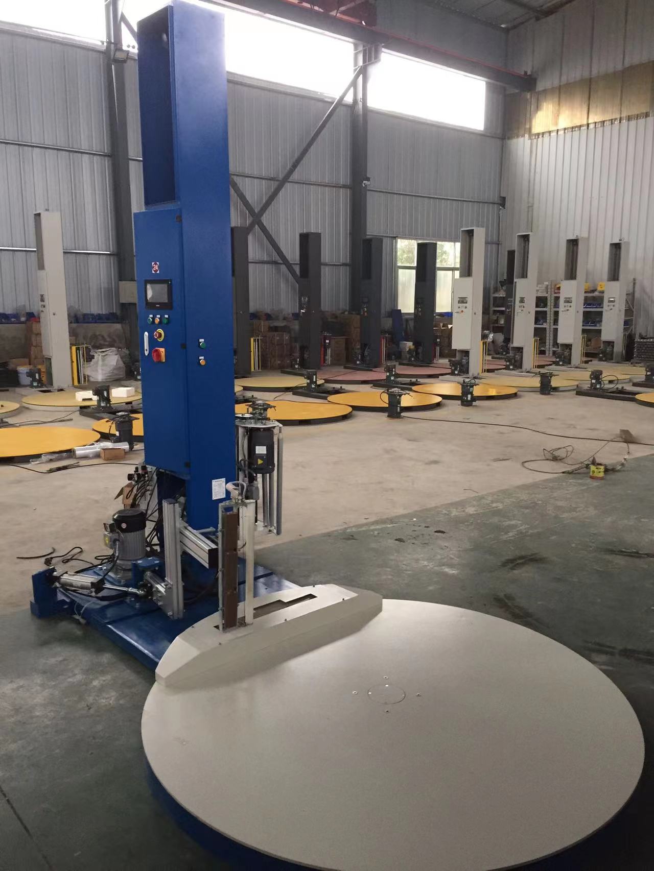 L’emballeuse automatique de palettes de plateau tournant a une pince à film automatique et une unité de coupe sur la platine. La télécommande est disponible pour une meilleure automatisation.